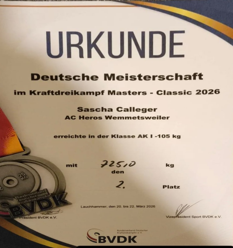 Unter 21 Teilnehmern in der Gewichtskategorie bis 93 Kg und quer durch alle Altersklassen sicherte sich Calleger im traditionellen Frankfurter „KSV-Cup“ einen hervorragenden zweiten Rang hinter dem 10 Jahre jüngeren Maximilian Stock. Die Einzelleistungen dürften dabei jedem Kenner der Kraftsportszene ein Zungenschnalzen entlocken. Für den gelungenen Auftakt sorgten zunächst 225 Kilo in der tiefen Kniebeuge. „Der letzte Versuch mit weiteren 10 Kilo auf der Eisenhantel scheiterte nur kanpp an einem technischen Fehler“, zeigte sich der zielstrebige Wemmetsweiler Kraftsportler hinterher nicht ganz zufrieden. 165 Kilo folgten in der Disziplin des Bankdrückens, bevor der zweite Rang nach sehr guten 270 Kg im Kreuzheben und einem Gesamtergebnis von 660 Kilogramm unter Dach und Fach gebracht werden konnte. Maximilian Stock aus dem mittelhessischen Haiger dominierte letztlich die Klasse mit einer Dreikampfleistung von 682,5 Kilogramm (Kniebeugen 242,5 / Bankdrücken 170 / Kreuzheben 270 Kg).